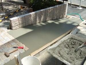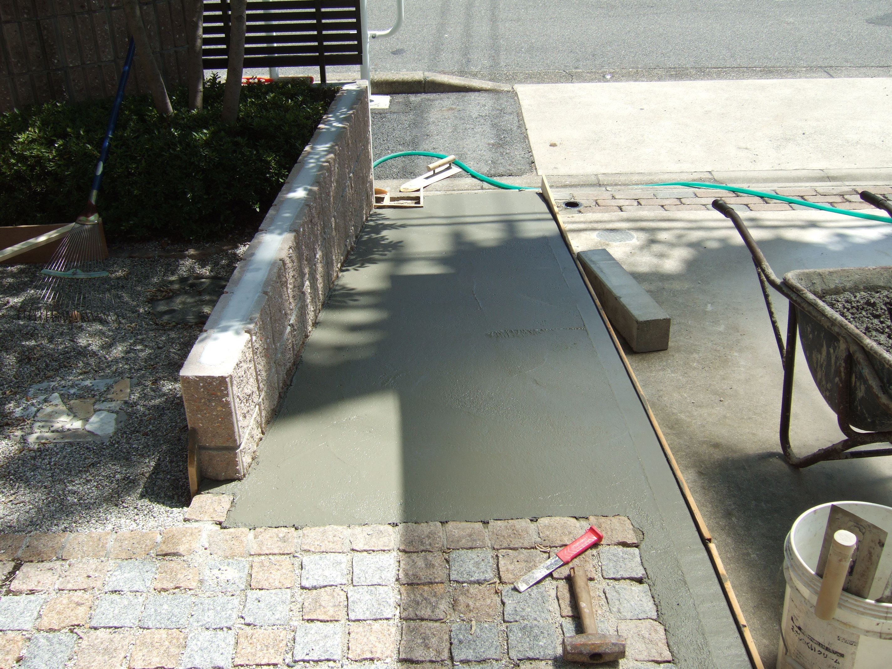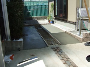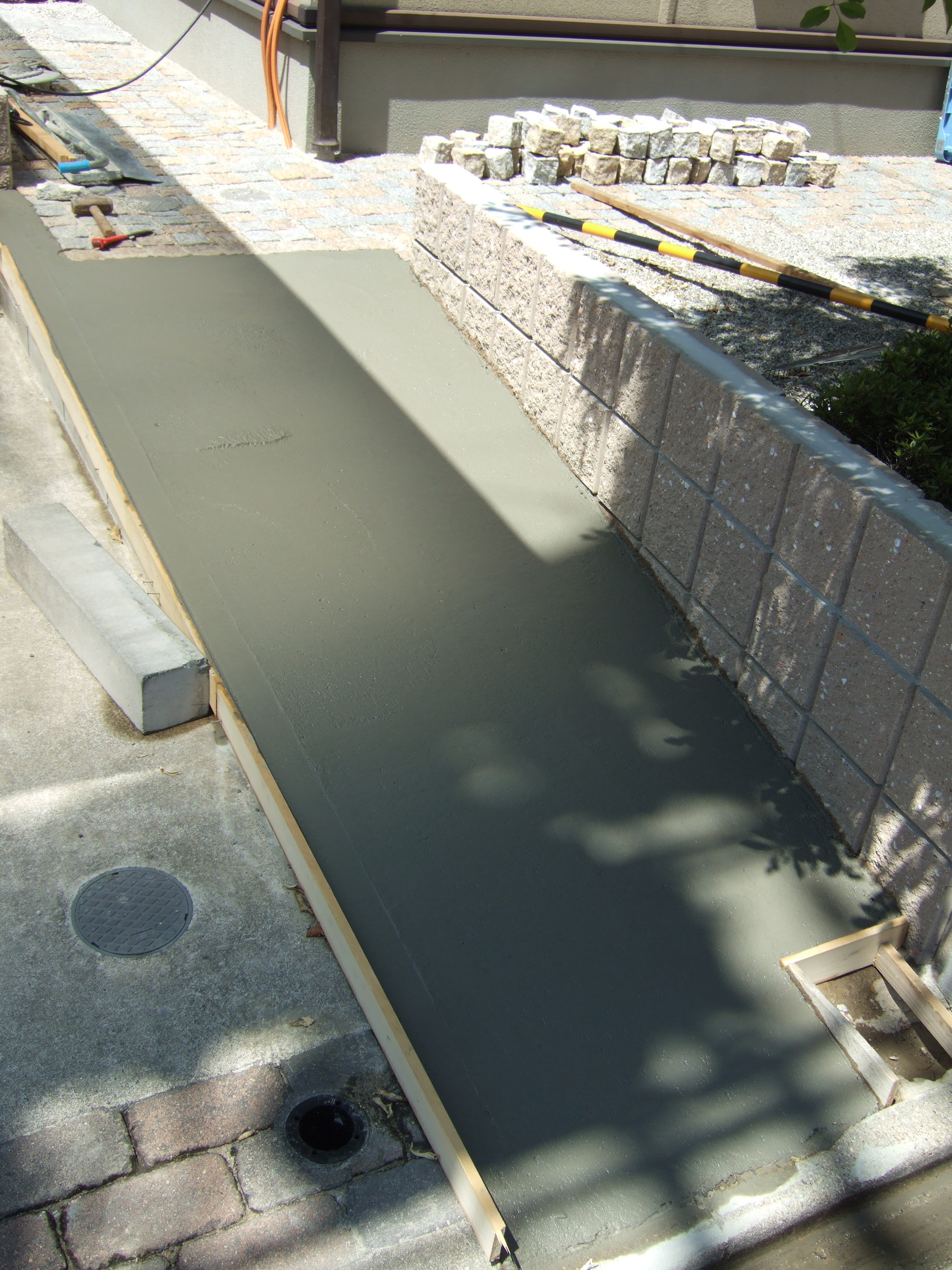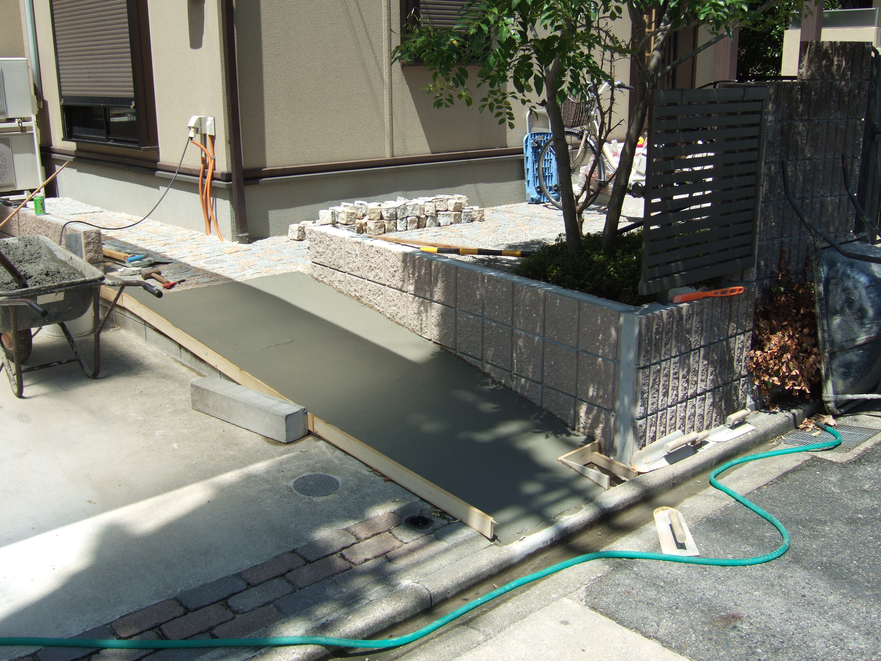 今回はコンクリートの打設です。新しい駐車場と、スロープにコンクリートを打っていきます。