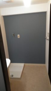 洗濯機防水パンの交換を行い、壁クロスはアクセント貼で納めています。