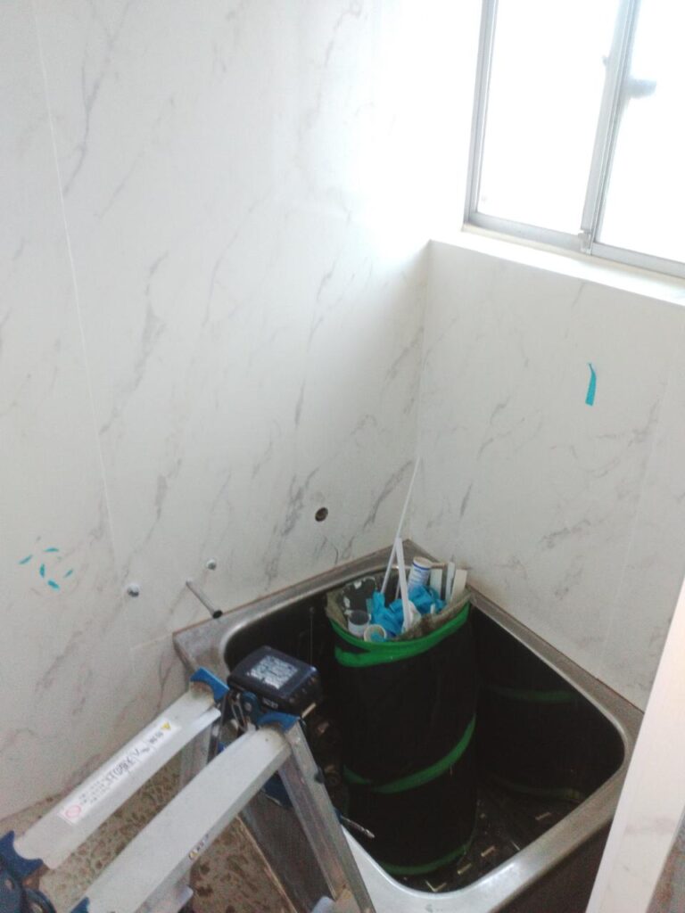 まだ作業途中ですが、壁面はバスパネル(鏡面タイプ)を貼り、天井はバスリブを取り付けます