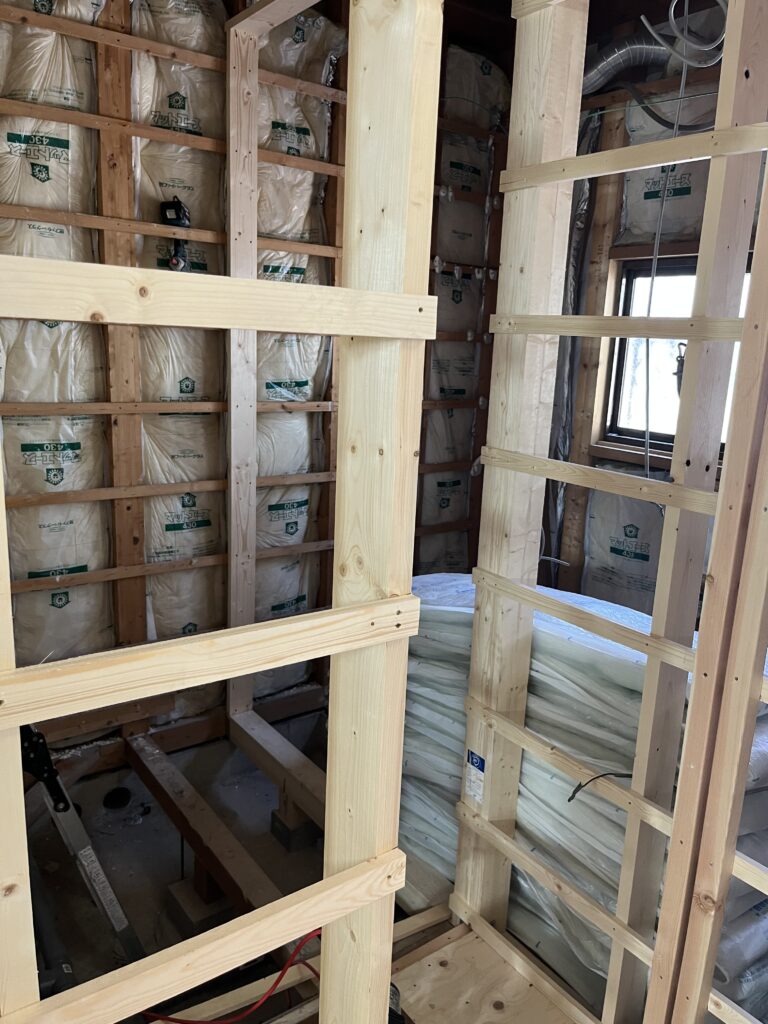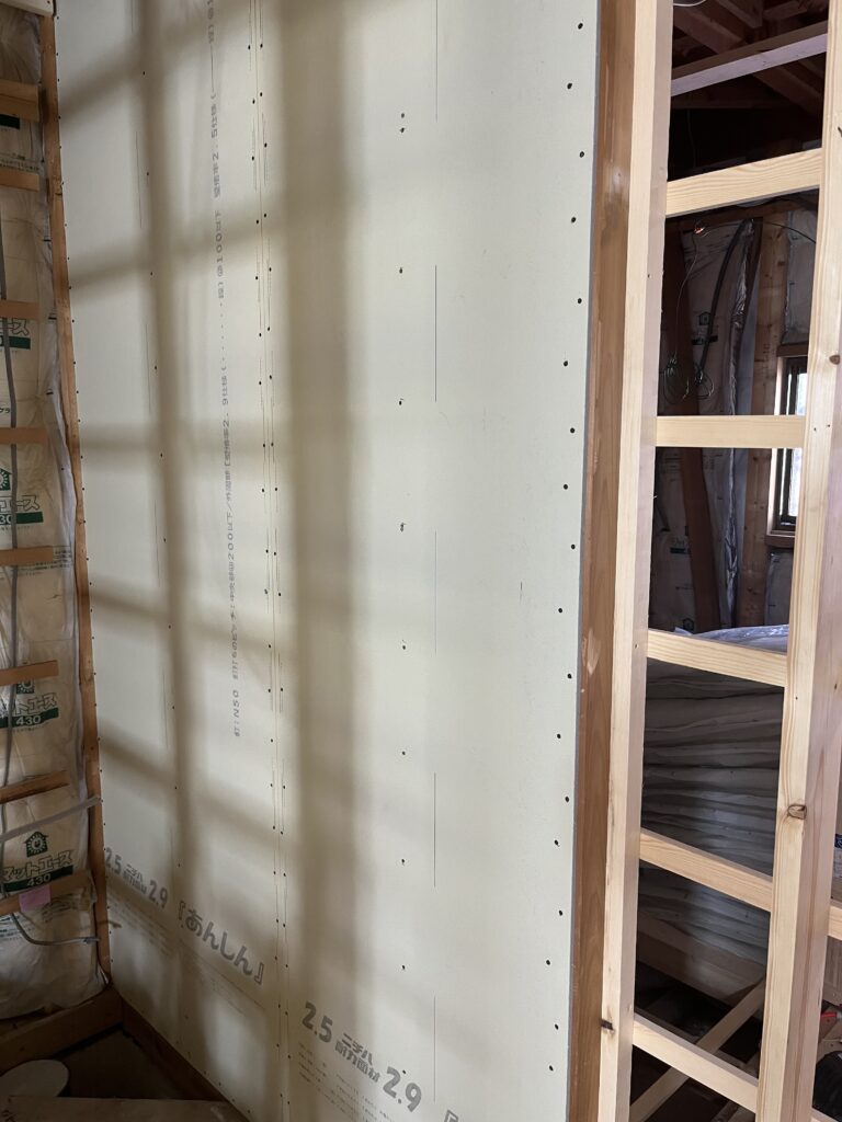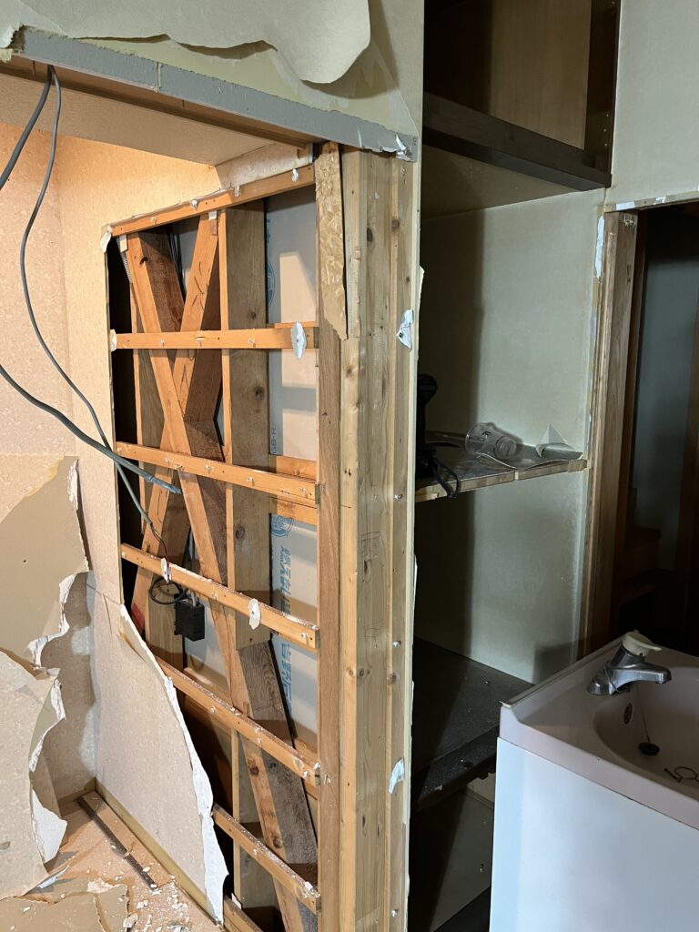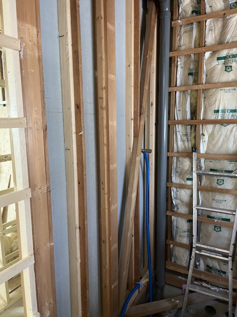 壁撤去作業中に壁の中から筋交いが出てきてしまい、その部屋にユニットバス造作工事を予定しておりました。その筋交いが邪魔しており、何とかこのスペースを確保するために隣の壁を耐力壁にして、強度を確保する為にニチハあんしん(耐力壁)を行いまして、建物の強化を保つ工法を行いました。