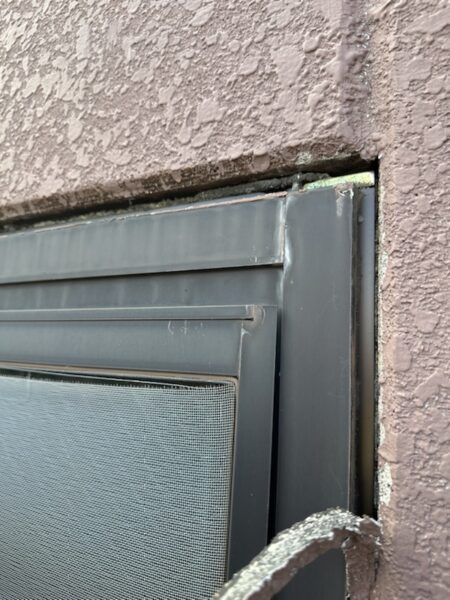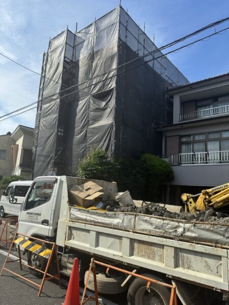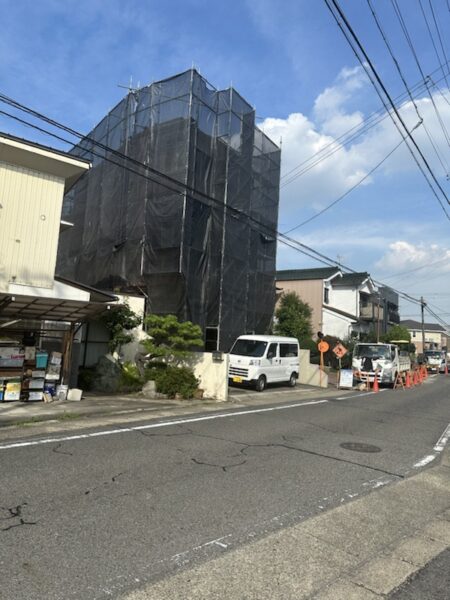 コーキング打ち替えと防水工事、を同時に工事依頼されました、まずは足場を掛けて、ネットを張りましてコーキング打ち替え工事を先行します、劣化が進んでたので