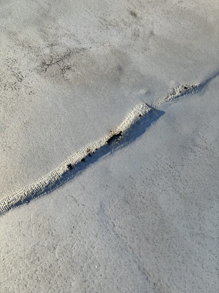 もしやと思い屋上に上がると20年以上手つかずのウレタン防水、、各所に細かい穴や亀裂があり非常に危険な状態でした。