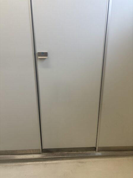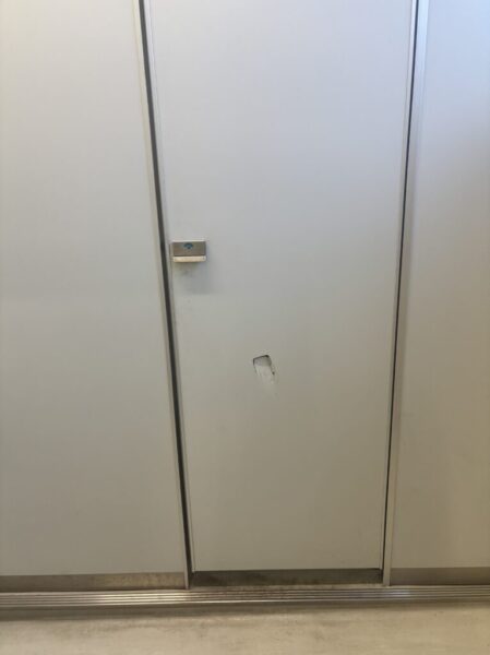 共用トイレの扉に穴が!だれがどのようにしてこうなったのかは、不明。。